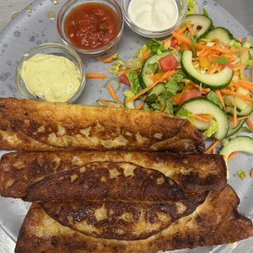 | Mexicanske pandekager m/ salat, guacamole, salsa & cremefraiche | 129,- |