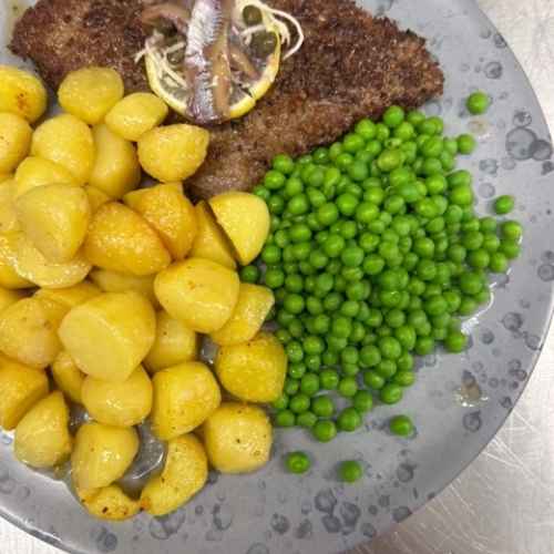 | Wienersnitzel m/ brasede kartofler og ærter, smørsovs eller bearnaisesauce | 229,- |