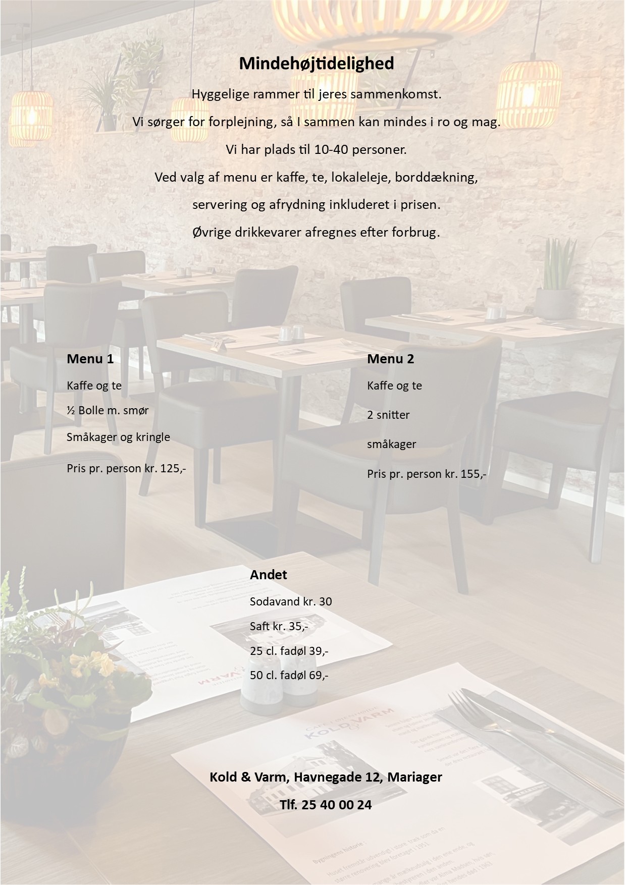 Ved valg af menu er kaffe, te, lokaleleje, borddækning, servering og afrydning inkluderet i prisen.